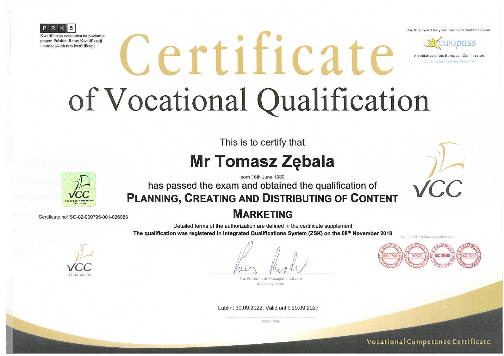 Posiadam międzynarodowy certyfikat ISO potwierdzający moją kompetencję związaną z prowadzeniem marketingowych projektów szkoleniowych:
